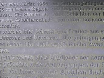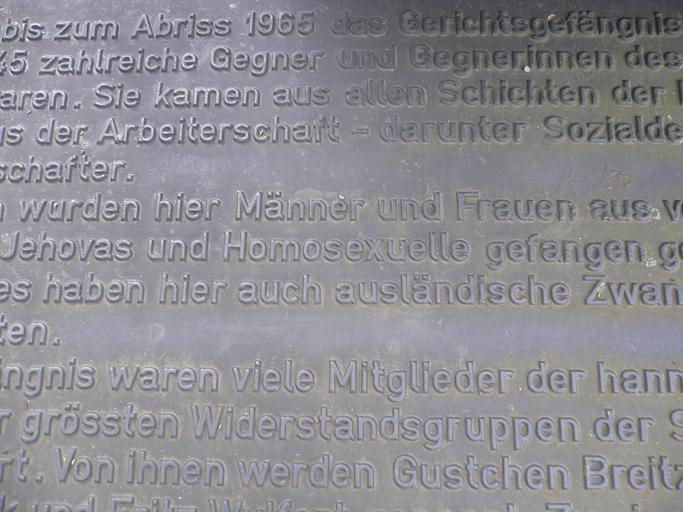 | Keywords: Denkmal am Pavillon 002.jpg Nazism in Hanover between culture center Pavillon Raschplatz place and the Hannover Central Station Hannover Hauptbahnhof Hannover Hbf Mahnmal Gerichtsgefängnis Hannover vor dem Pavillon wurde am 8 Mai 1989 eingeweiht dem Jahrestag der Befreiung vom Nationalsozialismus Das von Hans-Jürgen Breuste entworfene Mahnmal zeigt verschiedene unterbrochen vertikal angeordnete Stahlgitter-Platten die von einem großen Andreaskreuz gekreuzt werden Die liegende Inschrift am Fuß des Mahnmals weist über die Hamburger Allee in Richtung Raschplatz bis wohin die Mauern des abgebrochenen Gerichtsgefängnisses reichten Die Inschrift lautet Hier stand bis zum Abriß 1964 das Gerichtsgefängnis Hannover in dem von 1933 bis 1945 zahlreiche Gegner und Gegnerinnen des Nationalsozialismus inhaftiert waren Sie kamen aus allen Schichten der Bevölkerung bis 1937 vor allem aus der Arbeiterschaft - darunter Sozialdemokraten Kommunisten und Gewerkschafter Außer ihnen wurden hier Männer und Frauen aus verfolgten Minderheiten wie Sinti Zeugen Jehovas und Homosexuelle gefangengehalten Während des Zweiten Weltkrieges haben hier auch ausländische Zwangsarbeiter und Zwangsarbeiterinnen gelitten In diesem Gefängnis waren viele Mitglieder der hannoverschen Sozialistischen Front einer der größten Widerstandsgruppen der SPD gegen den Nationalsozialismus inhaftiert Von ihnen werden Gustchen Breitzke Fritz Lohmeyer Therese Wittrock und Fritz Wulfert genannt Zu einer Widerstandgruppe der Sozialistischen Arbeiterpartei gehörte Otto Brenner Von 1937 bis 1943 saß hier der Vorsitzende der KPD Ernst Thälmann in Einzelhaft Stellvertretend für die Verfolgten aus dem kommunistischen Widerstand werden Paul Arndt Marianne Baecker Grete Hoell und Walter Krämer genannt Das Mahnmal Gerichtsgefängnis erinnert daran daß sich Justiz und Polizei als Helfershelfer des Faschismus betätigten Hier war ein Ort der Denunziation an dem Menschen willkürlich und aus politischen Gründen inhaftiert waren own Rainer Hoffschildt Memorials in Hannover Mahnmal Gerichtsgefängnis Hannover Monuments and memorials to victims of National Socialism in Lower Saxony Lister Meile Hannover Mahnmal Gerichtsgefängnis Hannover Jehovah's Witnesses in Germany |