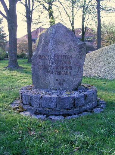 | Keywords: Denkstein Oyten.jpg en Memorial stone de Denkstein in Oyten Die Bürgerinitiative gegen den Ausbau der B75 ließ 1982 den Denkstein anfertigen und in der geplanten Ausbautrasse der Bundesstraße 75 heute L168 in der Ortslage Oyten aufstellen Bei Beginn der Straßenbauarbeiten für die anbaufreie Strecke zwischen Lindenstraße / Dorfstraße und der Landesstraße L167 K2 / Achimer Straße wurde der Stein vor das Rathausgelände umgesetzt Niederdeutsche Inschrift Solange dieser Stein bleibt stehen wird unsere Hoffnung nicht vergehen Oyten 1982 nds SOLANGE Dà SSE STEEN BLIFFT STAHN SCHALL USE HOFFNUNG NICH VERGAHN OYTEN 1982 own OytenHeute 2010-04-18 Oyten Taken with Ricoh Caplio G4 wide |