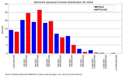 | Keywords: Denmark personal income by sex.svg translate yes en Personal income distribution of Denmark by sex for 2014 Gender bias favors women below 400 000 DKK men above 400 000 Over four times as many men as women earn over 1 000 000 DKK a year Data from Statistics Denmark http //www statistikbanken dk/04 INDKP102 2016-05-27 own Delphi234 other versions current annually cc-zero Income distribution in Denmark SVG bar charts Histograms | ||||
