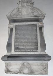 Keywords: Dennis family memorial, Saint Thomas à Becket, Pucklechurch, South Gloucestershire, UK - 20090920.jpg The Dennis family memorial tablet in the north aisle of the parish church of Saint Thomas à Becket w Pucklechurch South Gloucestershire England UK It was erected after 1660 The Latin inscription on the tablet reads as follows <blockquote> Monumento In memoriam Johannis Dennis Armigeri primo-geniti et haeredis Henrici Dennis Armigeri qui 26 die Junii Anno Domini 1638 ex hac vita decessit postquam ex uxore sua Margareta Domini Georgii Speake de Whight-lackington in Comitatu Sommerset Equitis balnei e filiabus una Duos accepisset filios Johannem Scilecet et Henricum Equibus Johannes Dennis de Puckle-church alias pulcher-Church in Comitatu Gloucestriae Armiger duxit Mariam Nathanielis Still de Hutton in Comitatu Somerset Armigeris filiarum et cohaeredum Unam; ex qua tres accepit filios et filiam unam viz Henricum Johannem Gulielmum et Margaretam Hoc Quod est pulchri Templum est pulchrius </blockquote> It may be translated into English thus <blockquote> Monument In memory of John Dennis Esquire first-born and heir of Henry Dennis Esquire who on the 26th day of June in the year of Our Lord 1638 departed from this life after he had received from his wife Margaret one out of the daughters of George Speke Lord of Whight-lackington in the county of Somerset Knight of the Bath two sons that is to say John and Henry knights John Dennis of Puckle-church otherwise pulcher- i e beautiful Church in the county of Gloucester Esquire married Mary one of the daughters and co-heiresses of Nathaniel Still of Hutton in the county of Somerset Esquire; from whom he received three sons and one daughter that is to say Henry John William and Margaret By this monument what is a beautiful temple is become more beautiful </blockquote> 2009-09-20 14 53 Own ; originally uploaded to https //en wikipedia org en wikipedia on 2011 08 03 Lobsterthermidor at en wikipedia cc-zero Lobsterthermidor at http //en wikipedia org en wikipedia Original upload log page en wikipedia DennisMemorialSlatePucklechurch jpg 2011-08-03 19 48 Lobsterthermidor 1905×2706 803750 bytes <nowiki>Dennis family memorial slate tablet at Pucklechurch church north aisle erected post 1660 </nowiki> Henry Dennis sheriff Saint Thomas à Becket Pucklechurch Wall mounted church monuments in Gloucestershire |