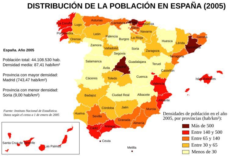 | Keywords: Densidades de población en España (2005).svg Mapa de España con las densidades de población por provincias según el censo del Instituto Nacional de Estadística a 1 de enero de 2005 Instituto Nacional de Estadística de España http //www ine es/inebase/cgi/um M 2Ft20 2Fe260 O inebase N L 2007 Creado por Rodriguillo tomando como mapa base Image Provinces of Spain svg creado por Emilio Gómez Fernández Image Densidades de población en España 2005 png Rodriguillo Population density maps of Spain |