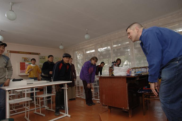 | Keywords: Deployed Airmen Teach English to Kyrgyzstan Kids DVIDS18076.jpg en Cpt Arnold Sauve right and Airman 1st Class Chiquita Ferdinand not seen use body part names in a song to tutor students in English at Lyceum vocational school Kyrgyz Republic The in-residence vocational school is home for more than 200 local boys and girls ages 14-18 Here they are taught the basics in high demand skills for the Bishkek region The training in tailoring mechanics agriculture and services allow the children who in most cases were abandoned orphaned or simply poor; a better opportunity to gain employment in the local economy Manas Air Base Outreach Society is a non-profit organization established at Manas Air Base in December 2003 Lyceum is one of its several focus groups that have donated more than 17 000 man-hours 65 000 and 40 000 pounds of donations to heart operations heating fuel construction projects elderly stipends trips and daily administration costs Capt Arnold Sauve is deployed to the 376th Expeditionary Medical Squadron from the 2nd Medical Group Barksdale Air Force Base LA; and Airman 1st Class Chiquita Ferdinand a Valdosta GA native is deployed to the 376th Expeditionary Mission Support Group 509th Bomb Wing Whiteman Air Force Base MO They are deployed to the 376th Air Expeditionary Wing Manas Air Base Kyrgyz Republic U S Air Force photo/Master Sgt Lance Cheung 2006-03-17 Lance Cheung https //www dvidshub net/image/18076 18076 2006-04-11 14 11 MANAS AIR BASE KG PD-USGov Barksdale Air Force Base Whiteman Air Force Base 376th Air Expeditionary Wing United States Air Force Images from DoD uploaded by Fæ |