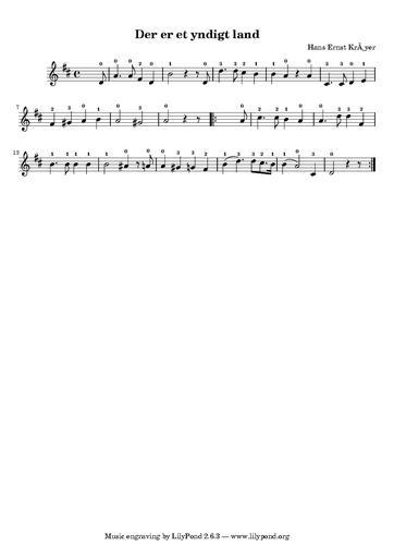 Keywords: Der er et yndigt land-violin.png Danish national anthem lyrics by Adam Oehlenschläger The sheet music is with help for beginner violin LilyPond source <pre> \include deutsch ly \version 2 6 4-5 \header title Der er et yndigt land composer Hans Ernst Krøyer melody \clef treble \time 4/4 \key d \major \relative c' s2 s4 s8 d-0 a'4 -0 a8-0 fis4-2 d-0 h'2-1 r4 r8 d -0 d'4 -3 d8-3 cis4-2 h-1 h-1 a-0 r a-0 cis 4 -3 cis8-3 d4-0 e-1 fis4-2 gis-3 a-0 h-1 a2-0 gis-3 a-0 r4 r8 s8 \bar \repeat volta 2 s2 s4 s8 a-0 cis4 -2 cis8-2 h4-1 a-0 a4 -0 d8-3 d4-3 fis -2 h4 -1 h8-1 h4-1 h-1 h2-1 ais4-0 r8 a-0 a4-0 gis-3 g-3 fis-2 h-1 d4 -3 d8-3 cis8 -2 h16-1 h4-1 a2-0 cis 4-3 d2-0 r4 r8 s8 \score \new Staff \melody </pre> Also See Der_er_et_yndigt_land mid Find midi here <br> Der_er_et_yndigt_land ogg Find Ogg here <br> thumb 250px left Music Sheet <br style clear both; > PD-old Anthems of Denmark Sheet music |