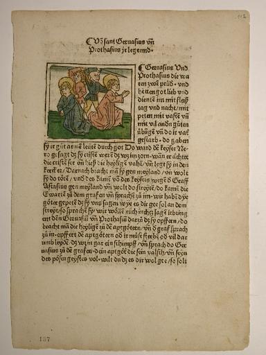 | Keywords: Der Heiligen Leben Sommerteil GWM11352, H 9970, Schramm III, 387.jpg en Jacobus de Voragine Der Heiligen Leben Sommerteil Saint Gervasius Gervais Gervase und Prothasius Protasius Protais Augsburg Johann Bämler 19 August 1475 Type 1a 2 de Jacobus de Voragine Der Heiligen Leben Sommerteil GWM11352 H 9970 Schramm III 387 Sant Gervasius Gervais Gervase und Prothasius Protasius Protais Augsburg Johann Bämler 19 August 1475 Type 1a 2 Der italienische Prediger und Schriftsteller Jacobus de Voragine Viraggio aus dem heutigen Varazze bei Genua lebte von 1230 - 1298 Der Dominikaner Jacobus de Voragine fügte aus der Bibel den Apokryphen verschiedenen Akten sowie überlieferten Geschichten die Lebensgeschichten der Heiligen zur Legenda Aurea Das Werk in volkstümlicher lateinischer Sprache geschrieben wurde zum populärsten religiösen Volksbuch des Mittelalter Die deutschen à bersetzungen der Legenda Aurea wurden das Leben der Heiligen oder Der Heiligen Leben genannt Zahlreiche Anzeichen deuten heute darauf hin dass zwischen 1384 und 1421 im Umkreis des Dominikanerordens in Nürnberg eine neue Kompilationen der Heiligenlegenden entstand die unter Einbeziehung der Legenda aurea stärker auf den deutschsprachigen Glaubensraum bezogen waren So wurden in diesem Legendar Bonifazius Gallus Kilian oder Magnus von Füssen aufgenommen Dieser deutsche Legendar übertraf in seiner Verbreitung die Leganda Aurea Becker; Overgaauw Aderlass + Seelentrost 2003 219 Gervasius à bers Speerknecht Gervais Gervase Protasius Protais Märtyrer von Mailand Gervasius starb vermutlich zusammen mit Protasius um 300 unter Kaiser Diokletian in Mailand den Märtyrertod Beide Heiligen sind die Stadtpatrone von Mailand Breisach und Bormio Nach einer Legende waren Gervasius und Protasius Zwillinge zur Zeit Neros Sie wurden in Rom als Christen gefangen nach Mailand gebracht wo Gervasius mit Geißeln zu Tode gepeitscht und Protasius enthauptet wurde 1162 soll Rainald von Dassel Reliquien des Heiligen Gervasius und Heiligen Protasius nach Breisach gebracht haben wo diese sich heute im Münster in einem Reliquienschrein befinden 2002-01-01 00 01 38 http //www zvab com/buch-suchen/titel/Der-Heiligen-Leben/autor/Voragine Zwab Jacobus de Voragine PD-old-100 Legenda Aurea Uploaded with UploadWizard Saint Gervasius Saint Protasius |