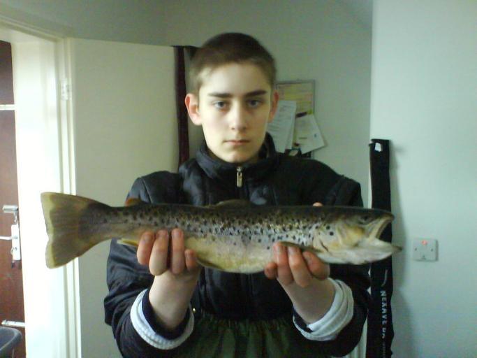 Keywords: Derwenttrout.JPG en a brown trout ready to be prepared Own Riverderwentfisherman 2009-03-14 Personality rights Animals of County Durham Salmo trutta People with fish