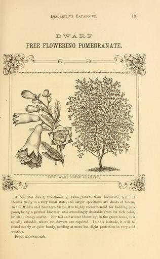 | Keywords: Descriptive catalogue of new, rare and beautiful plants, dahlias, chrysanthemums, geraniums, fuchsias, carnations, verbenas, phloxes, &c. for spring, 1873, cultivated and for sale by John Saul, (15814791374).jpg Descriptive Catalogue <br> 19 <br> id wa r f <br> FREE FLOWERING POMEGRANATE <br> A beautiful dwarf free-flowering Pomegranate from Louisville Ivy It <br> blooms freely in a very small state and larger specimens are sheets of bloom <br> In the Middle and Southern States it is highly recommended for bedding pur- <br> poses being a profuse bloomer and exceedingly desirable from its rich color <br> brilliant orange scarlet For fall and winter blooming in the green house it is <br> equally valuable where cut flowers are required In this latitude it will be <br> found nearly or quite hardy needing at most but slight protection in very cold <br> weather <br> Price 50 cents each 42482181 134502 67109 Page 19 Text http //www biodiversitylibrary org/page/42482181 1873 10 5962/bhl title 67109 Henry G Gilbert Nursery and Seed Trade Catalog Collection ; John Saul Firm Washington D C Biodiversity Heritage Library Descriptive catalogue of new rare and beautiful plants dahlias chrysanthemums geraniums fuchsias carnations verbenas phloxes c for spring 1873 cultivated and for sale by John Saul nurseryman seed grower and importer Garden Stories Catalogs Flowers Nurseries Horticulture Plants Seeds U S Department of Agriculture National Agricultural Library bhl page 42482181 dc identifier http //biodiversitylibrary org/page/42482181 Dwarf free flowering pomegranate bhlGardenStories BHLinbloom nurseries horticulture u s department of agriculture national agricultural library bhlgardenstories bhlinbloom Information field Flickr posted date ISOdate 2015-02-03 CC-BY-2 0 BioDivLibrary https //flickr com/photos/61021753 N02/15814791374 2015-08-25 01 53 20 cc-by-2 0 PD-old-70-1923 Descriptive catalogue of new rare and beautiful plants Photos uploaded from Flickr by Fæ using a script |