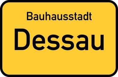 Keywords: dessau saxony-anhalt dessau-roßlau bauhaus town sign city limits sign entry sign gateway sign traffic road sign street sign directory yellow germany direction unesco world heritage site