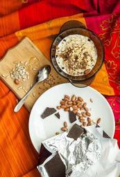 Keywords: dessert food oatmeal bright peanuts chocolate sweet delicious useful breakfast nutrition plate sweets nuts home taste colorful kitchen dish
