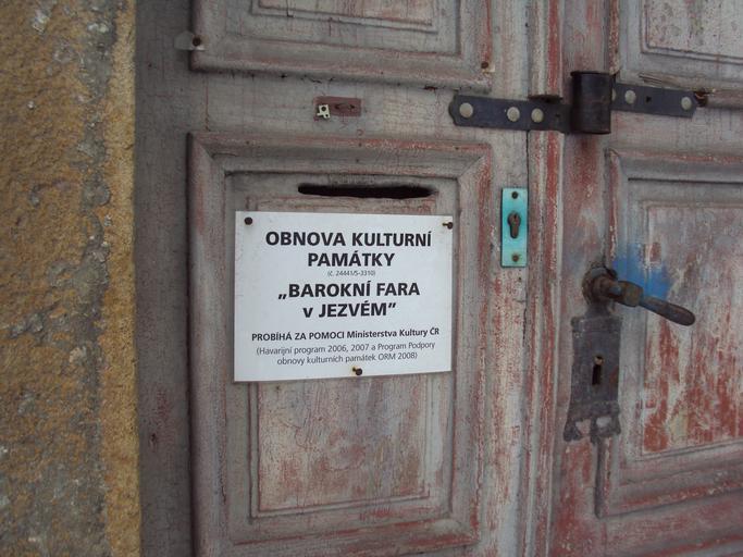 | Keywords: Detail fara Jezvé.jpg cs Info na dveřích opuštěné fary v Jezvé own Zákupák 2010-12-29 Jezvé Rectories in Česká Lípa District Doors in Česká Lípa District Wooden doors in Liberec Region Czech inscriptions in Liberec Region Door handles in Liberec Region |