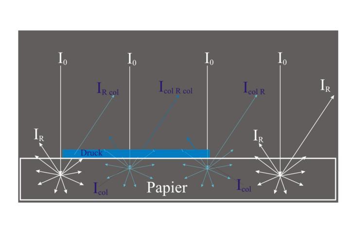 | Keywords: Detaillierte Situationen beim Lichtfang.svg de I0 Einfallender Lichtstrahl IR vom unbedruckten Papier remittiert Icol nach Passage der Druckfarbschicht farbiger Lichtstrahl IRcol im unbedruckten Papier remittierter und nach 1 Passage farbiger Lichtstrahl IcolRcol zweimal durch Druckfarbschicht und remittiert IcolR erst durch Druckfarbschicht und dann remittiert own Inkman 2014-02-24 Technical Reproduction Cc-zero Uncategorized 2014 August 24 | ||||