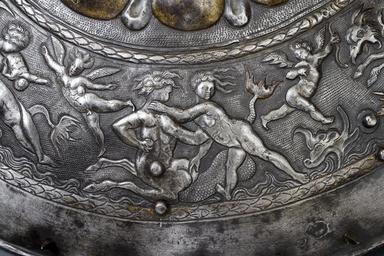 Keywords: Detalj, dekor, Rundsköld, Polen ca 1550, efter italiensk förebild - Livrustkammaren - 58742.tif Rund sköld med dekor i tre fält Ytterst en slät kantbård i ytterkanten 36 fyrsidiga taggar med spår av förgyllning Därinnanför en ring kantad med lagerkransbårder spår av förgyllning på ringen i hög relief ett nereid-och tritontåg mot punsad bakgrund spår av förgyllning I mitten en krysantemumblomma med 12 större blad med rester av förgyllning och däremellan smalare blanka blad I mitten en uppdriven spets däri inskruvat en 142 mm hög balusterformig fyrsidig spets med fasade kanter rester av förgyllning Ett hål på vardera sidan om spetsen <br/><br/>På baksidan ett kraftigt stålhandtag l 150 mm på motsatta sidan fastnitat en läderrem l 330 mm med ett hål samt en sölja av stål fastnitad i ett dubbelt stålband b 30 mm som i sin tur är nitat i skölden <br/><br/>Krigsbyte från Warszawa 1655-08-30 I LRK äldre inventarier upptagen som en del av Magnus Ladulås rustning utställd i kungalängden i Riddarholmskyrkan 1823-1855 original caption Detalj dekor Rundsköld Polen ca 1550 efter italiensk förebild LRK 2935<br/> Nyckelord Mytologisk Amoriner Sköld Detalj Kentaur Föremålsbild Fantasidjur Erövringen av Warszawa ca 1550 steel - leather g 4730 size mm 565 LRK Wawel 1000-2000 2000 Eagle and Three Crowns 2002 Eagle and Three Crowns 2002 Sweden and Europe 1632-1792 2003-2004 Örnen och de tre kronorna 2003 Parures Triomphales 2003 Krigsbyte 2007-2008 Imagines potestatis - Regalia and Symbols of Authority of Polish Kings and Grand Masters of the Teutonic Knights 2007 Europa Jagellonica 1386-1572 - Kunst und Kultur Mitteleuropas zur Zeit der Jagiellonen 2012-2013 Kutná Hora Warszawa Potsdam place of origin original filename lm_dig2886 39545 inventory number LRK 2935 58742 CC-BY-SA Göran Schmidt <gallery caption Different images of same object > File Detalj dekor Rundsköld Polen ca 1550 efter italiensk förebild - Livrustkammaren - 50181 tif File Rundsköld - Livrustkammaren - 25699 tif File Rundsköld - Livrustkammaren - 77058 tif File Detalj dekor Rundsköld Polen ca 1550 efter italiensk förebild - Livrustkammaren - 67304 tif </gallery> Göran Schmidt Media contributed by LSH unmatched event Media contributed by LSH unmatched objKeyword Media contributed by LSH unmatched place Media contributed by LSH unmatched keyword Round shields Color images from Livrustkammaren Shield images from Livrustkammaren Media contributed by LSH 2013-10 |