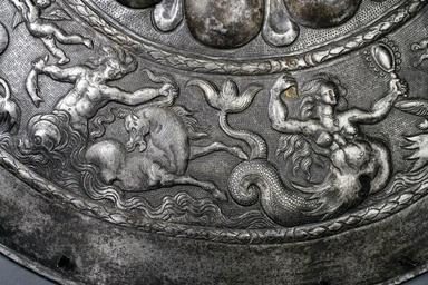 Keywords: Detalj, dekor, Rundsköld, Polen ca 1550, efter italiensk förebild - Livrustkammaren - 67304.tif Rund sköld med dekor i tre fält Ytterst en slät kantbård i ytterkanten 36 fyrsidiga taggar med spår av förgyllning Därinnanför en ring kantad med lagerkransbårder spår av förgyllning på ringen i hög relief ett nereid-och tritontåg mot punsad bakgrund spår av förgyllning I mitten en krysantemumblomma med 12 större blad med rester av förgyllning och däremellan smalare blanka blad I mitten en uppdriven spets däri inskruvat en 142 mm hög balusterformig fyrsidig spets med fasade kanter rester av förgyllning Ett hål på vardera sidan om spetsen <br/><br/>På baksidan ett kraftigt stålhandtag l 150 mm på motsatta sidan fastnitat en läderrem l 330 mm med ett hål samt en sölja av stål fastnitad i ett dubbelt stålband b 30 mm som i sin tur är nitat i skölden <br/><br/>Krigsbyte från Warszawa 1655-08-30 I LRK äldre inventarier upptagen som en del av Magnus Ladulås rustning utställd i kungalängden i Riddarholmskyrkan 1823-1855 original caption Detalj dekor Rundsköld Polen ca 1550 efter italiensk förebild LRK 2935<br/> Nyckelord Sköld Mytologisk Detalj Fantasidjur Blankvapen Föremålsbild Erövringen av Warszawa ca 1550 steel - leather g 4730 size mm 565 LRK Wawel 1000-2000 2000 Eagle and Three Crowns 2002 Eagle and Three Crowns 2002 Sweden and Europe 1632-1792 2003-2004 Örnen och de tre kronorna 2003 Parures Triomphales 2003 Krigsbyte 2007-2008 Imagines potestatis - Regalia and Symbols of Authority of Polish Kings and Grand Masters of the Teutonic Knights 2007 Europa Jagellonica 1386-1572 - Kunst und Kultur Mitteleuropas zur Zeit der Jagiellonen 2012-2013 Kutná Hora Warszawa Potsdam place of origin original filename lm_dig2887 39545 inventory number LRK 2935 67304 CC-BY-SA Göran Schmidt <gallery caption Different images of same object > File Detalj dekor Rundsköld Polen ca 1550 efter italiensk förebild - Livrustkammaren - 50181 tif File Rundsköld - Livrustkammaren - 25699 tif File Rundsköld - Livrustkammaren - 77058 tif File Detalj dekor Rundsköld Polen ca 1550 efter italiensk förebild - Livrustkammaren - 58742 tif </gallery> Göran Schmidt Round shields Media contributed by LSH unmatched event Media contributed by LSH unmatched objKeyword Media contributed by LSH unmatched place Media contributed by LSH unmatched keyword Color images from Livrustkammaren Shield images from Livrustkammaren Media contributed by LSH 2013-10 |