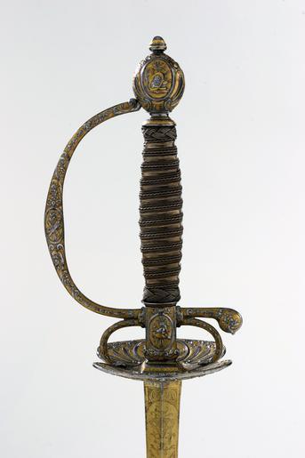 | Keywords: Detalj fäste - Livrustkammaren - 65286.tif Fäste av reliefsnidat stål delvis förgyllt Knapp nötformig med tämligen hög rundat konisk nitknapp bågformig handbygel med spetsovalt tvärsnitt kort rak bakre parerstång med rund ytterände böjd nedåt-utåt tämligen höga fingerbyglar njurformiga parerplåtar Ornering genomgående av ovala medaljonger och bladornament i polerat stål utsparade mot mattpunsad förgylld botten I medaljongerna på knappen på utsidan en emblemgrupp med en oval sköld vari Henrik IV s huvud i profil på insidan en emblemgrupp med en oval sköld vari ett Medusahuvud Medaljongerna på båda sidor av handbygelns mitt krysset parerstångens ytterände och parerplåtarna olika grupper av föremål och emblem däribland på parerplåtarnas insida på den yttre en örn med en lagerkrans i näbben på den inre en jordglob och en Merkuriusstav caducé <br/>Kavel med lindning av dels spunnen dels tvinnad silvertråd omväxlande med förgylld silverlan upptill och nedtill en krans av flätad tvinnad tunn silvertråd <br/><br/>Klinga rak treeggad s k stukatklinga Starka delen med etsad och förgylld ornering mot upptill tvärt avskuren blånerad botten Baspartiet på båda sidor helt förgyllt med etsad ornering på utsidan bladornament på insidan inskription i skrivstil Le Court Fourbisseur Du Roy Rue St Honoré Pres Celle Des' Poulies au Grand Monarque a Paris På utsidan härovanför fristående för-gyllda bladornament på insidan ett mindre rankornament en kvinnogestalt med slöja bågformigt kastad över huvudet och två mindre rankornament original caption detalj fäste - LRK 9943 ca other date - 1710 1730 steel b1 - Blankvapen - fäste material stål - steel b2 - Blankvapen - klinga material stål - silver thread b6 - blankvapen - kavel och kavelklädsel material silvertråd g 360 size mm 20 klinga size mm 761 klinga size mm 101 size mm 935 LRK Axel Hans A von Fersen greve riksmarskalk Carl August Gyldenstolpe Kammarherre Gallica 1945 Livrustkammarens basutställning 1978 Kungligt klädd 1987-1989 Fäktning på lek och allvar Modelejon 2002 Le Court Fourb anv b2 - blankvapen - klinga; Le Court Le Court Fourb anv b2 - blankvapen - klinga; Le Court place of origin original filename lm_dig0421 46473 inventory number LRK 9943 65286 CC-BY-SA Göran Schmidt <gallery caption Different images of same object > File Värja LeCourt - Livrustkammaren - 56725 tif File Kavaljersvärja Frankrike c 1710-1730 - Livrustkammaren - 467 tif File Kavaljersvärja Frankrike c 1710-1730 - Livrustkammaren - 17566 tif File Kavaljersvärja Frankrike c 1710-1730 - Livrustkammaren - 26066 tif </gallery> Göran Schmidt Media contributed by LSH unmatched material Media contributed by LSH dim-with multiple size templates Media contributed by LSH unmatched creator Color images from Livrustkammaren Smallsword images from Livrustkammaren Media contributed by LSH 2013-10 |