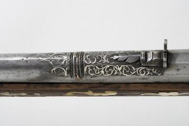 Keywords: Detalj pipdekor snapplåsbössa - Livrustkammaren - 83417.jpg Sexräfflad pipa med åttsidig pipa och trumf Partiet däremellan med svinrygg Dekor på bakre delen av kammaren framför siktet samt hela trumfens ovansida i form av rankornament av påslaget silver På de två senare ställena två tvärgående profilerade band med dekor av koppar och mässing <br/>Riktmedel Vingformigt sikte av stål med profilerad klack avslutad framåt med bladornament Spolformigt stolpkorn av mässing <br/><br/>Snapplås av skandinavisk-baltisk typ Plant låsbleck med kulformigt utskott baktill Hane av baltisk typ med lös överkäke ringformigt käkskruvhuvud Batteri med omvändningseldstål med liten fjäder fastskruvad på fängpannelocket mellan eldstål och pipa Fängpanna med plan gavel rundad nederkant med filad dekor Eldstål av flintlåsform med profilerad åsning på ryggen Batterifjäder utan studel <br/>Fästning Två låsskruvar <br/>Rak avtryckare <br/><br/>Helstock av trä med kolv av tysk-rysk typ med bred vinge Bakplåt av trä med sex kolvkulor av stål Åsat kolvlådelock med rektangulära benplattor på ändarna samt två rombiska plattor på mitten Mellan kolvlådelock och lås inslaget hertig Karls rustkammarstämpel spegelmonogram C krönt med hertigkrona Glest yttäckande dekor i form av inlagda ben- och pärlemorplattor på anslagethjärtformiga och blomformiga inläggningar I mitten en rund genombruten benplatta En plan profilerad mellanrörka och en plan slät överrörka samt näsband samtliga av ben Varbygel av stål baktill utdragen och nedåtböjd med kulformig avslutning Båda varbygelfästena i form av bladornament En oval rembygel av stål fäst genomstocken med en skruv <br/><br/>Tillbehör <br/>Laddstock l 1040 mm av trä med skoning av stål l 137 mm original caption detalj pipdekor snapplåsbössa - LRK 7714 end other date century 17 steel e1247 - eldvapen - pipa lås riktmedel och beslag material stål - brass e4 - eldvapen - riktmedel material mässing - silver e5 - eldvapen - pipdekor material silver - wood e3 - eldvapen - stock material trä - bone e78 - eldvapen - stockbeslag och stockdekor material ben - mother-of-pearl e8 - eldvapen - stockdekor material pärlemor - brass e8 - eldvapen - stockdekor material mässing size mm 1436 size mm 1047 pipa size mm 139 g 4780 LRK Karl XIII av Sverige -Norge Basutställning Nordiska vapenformer place of origin Moskwa original filename lm_dig2523 43992 inventory number LRK 7714 83417 CC-BY-SA Göran Schmidt <gallery caption Different images of same object > File Detalj pipdekor snapplåsbössa - Livrustkammaren - 6371 jpg File Detalj stämpel stock snapplåsbössa - Livrustkammaren - 74858 jpg File Detalj stock snapplåsbössa v sida - Livrustkammaren - 57735 jpg File Detalj lås-stock snapplåsbössa - Livrustkammaren - 66296 jpg </gallery> Göran Schmidt Musket images from Livrustkammaren color images Flintlock muskets images from Livrustkammaren Media contributed by LSH dim-with multiple size templates Color images from Livrustkammaren Media contributed by LSH 2013-10