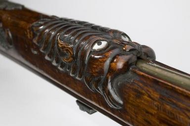Keywords: Detalj stockdekor slaglåsstudsare - Livrustkammaren - 39663.jpg Åttsidig brunerad räfflad pipa med trumf 8 räfflor högerräffling Pipan förlängd med ett obrunerat parti tvärt avskuret svansskruvblad graverad ranka På h sida vinge med tändhattsnippel På pipans översida graverad text under Bataillen vid Wiais och Helsinge d 28/9 1808 har Befälhafvaren för Svenska Finska Gardiet Conr Åkerhjelm tagit detta gevär från en rysk Jägare vid Regem n o 1 På kammarens v sida graverad text C Å 28/9 1808 på h sida C M Af R 1825 <br/>Riktmedel Klaffsikte av blånerat stål stolpkorn av mässing båda inlaxade <br/>Fästning Pipan fäst med blånerad krysskruv samt två engelska pipstift och däremellan rembygelns skruv <br/><br/>Slaglås av stål med välvt låsbleck och graverade bladrankor på hane och låsbleck bakåtliggande slagfjäder Harmynt slaghuvud nätskuret tumgrepp På låsets insida är slagfjäder stång och stångarm vända åt samma håll <br/>Fästning En låsskruv med åttsidig bricka <br/>Svagt böjd avtryckare Avtryckarbleck framtill avslutat med en urneformig platta med blad <br/><br/>Brun helstock av trä kolv av fransk typ med kindstöd och kolvlåda kolvhalsen nätskuren Rik snidad dekor på kolvens undersida ett fiskhuvud och på framstocken en lejonmaskaron båda med inlagda pärlemorögon samt snidade bladornament Bakom kindstödet en liggande hjort På kolvens undersida en oval vitmetall-plåt silver graverad med nr 1 Kolvlådelock med snidat tumgrepp med rund blomma locket öppnas genom att trycka på blommans mitt Näsband av horn övriga beslag av stål Bakplåt med en spetsig bladgraverad flik på kolvryggen Två runda rörkor Varbygel med graverade rankor fäst på avtryckarblecket En u-formig rembygel vid bakre rörka rund knapp bakom varbygeln <br/><br/>Tillbehör <br/>Laddstock av mässing l 663 mm original caption detalj stockdekor slaglåsstudsare - LRK 3669<br/> Nyckelord Dekorerade Lejon Studsare Jaktvapen Föremålsbild Gustav V - other date ca 1800 ca 1850 wood e3 - eldvapen - stock material trä - steel e1247 - eldvapen - pipa lås riktmedel och beslag material stål - mother-of-pearl e8 - eldvapen - stockdekor material pärlemor - brass e4 - eldvapen - riktmedel material mässing g 4190 size mm 670 pipa size mm 1080 LRK Oscar II av Sverige -Norge Carl Magnus af Robson bergsråd Karl XV av Sverige-Norge Gustaf V av Sverige Conrad Reinhold Åkerhielm överste place of origin original filename lm_dig2133 40201 inventory number LRK 3669 39663 CC-BY-SA Göran Schmidt <gallery caption Different images of same object > File Detalj slaglåsstudsare - Livrustkammaren - 22541 jpg File Detalj slaglåsstudsare v sida - Livrustkammaren - 48224 jpg File Detalj stockdekor slaglåsstudsare - Livrustkammaren - 48221 jpg File Detalj slaglåsstudsare - Livrustkammaren - 39666 jpg File Detalj slaglåsstudsare - Livrustkammaren - 31103 jpg File Detalj stockdekor slaglåsstudsare - Livrustkammaren - 65343 jpg File Detalj stockdekor slaglåsstudsare - Livrustkammaren - 56782 jpg </gallery> Göran Schmidt Lions in decorative arts Gustav V of Sweden Musket images from Livrustkammaren color images Flintlock muskets images from Livrustkammaren Media contributed by LSH unmatched material Media contributed by LSH dim-with multiple size templates Media contributed by LSH unmatched keyword Color images from Livrustkammaren Percussion muskets images from Livrustkammaren Wood carving Media contributed by LSH 2013-10