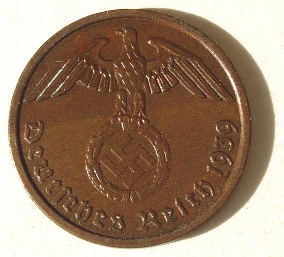 Keywords: Deutsches Reich 2 Pf 1939 A 62.jpg Deutsches Reich 2 Reichspfennig 1939 A d 20 mm 3 333 gramm Cu/Sn/Zn 950/40/10 NobbiP 2011-04-11 Deutsches Reich <gallery> File Deutsches Reich 2 Pf 1939 A 61 jpg 2 Reichspfennig 1939 </gallery> Nazi symbol Reichsmark coins of the Third Reich 0002 1939 coins Eagles on coins Nazi Swastikas |