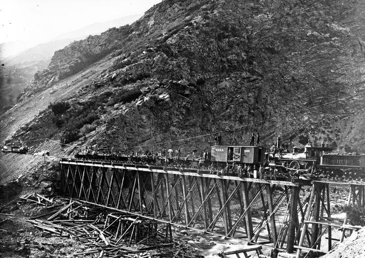 | Keywords: usgs railroad tbt throwbackthursday blackandwhite utah construction transportation technology train monochrome outdoor black and white Devil's Gate Bridge, Weber County, Utah 1869. Photo by W.H. Jackson, USGS. Devil's Gate Bridge, Weber County, Utah 1869. Photo by W.H. Jackson, USGS. |