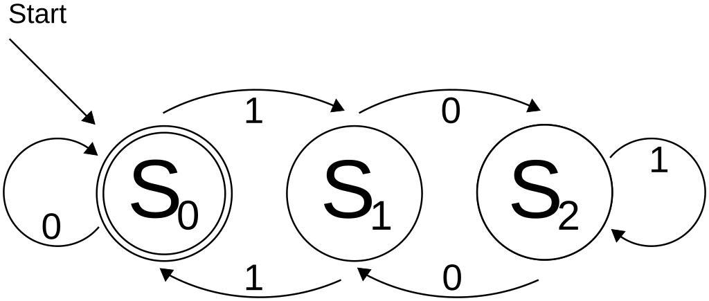 Keywords: DFA example multiplies of 3.svg Example of a DFA that accepts binary numbers that are multiplies of 3 Příklad deterministického konečného automatu který přijímá binární čísla která jsou beze zbytku dělitelná třemi own 2007-03-20 Self-made Original PNG Transition monoid wikitable - 808080 <br>012 808080 0 <br>021 808080 1 <br>102 808080 10 <br>120 808080 01 <br>201 808080 010 <br>210 - 808080 <br>012 808080 <br>012 808080 0 <br>021 808080 1 <br>102 808080 10 <br>120 808080 01 <br>201 808080 010 <br>210 - 808080 0 <br>021 808080 0 <br>021 808080 <br>012 808080 01 <br>201 808080 010 <br>210 808080 1 <br>102 808080 10 <br>120 - 808080 1 <br>102 808080 1 <br>102 808080 10 <br>120 808080 <br>012 808080 0 <br>021 808080 010 <br>210 808080 01 <br>201 - 808080 10 <br>120 808080 10 <br>120 808080 1 <br>102 808080 010 <br>210 808080 01 <br>201 808080 <br>012 808080 0 <br>021 - 808080 01 <br>201 808080 01 <br>201 808080 010 <br>210 808080 0 <br>021 808080 <br>012 808080 10 <br>120 808080 1 <br>102 - 808080 010 <br>210 808080 010 <br>210 808080 01 <br>201 808080 10 <br>120 808080 1 <br>102 808080 0 <br>021 808080 <br>012 Numeric entries denote functions mapping a state to a state; e g 102 abbreviates the function mapping state 0 1 and 2 to state 1 0 and 2 respectively; this is the function for digesting an input 808080 1 The table shows the result of function composition e g 021 102 201 and 102 021 120 808080 Grey entries give a shortest input string corresponding to a function cob Equivalent alternate representations - colspan 5 Regular grammar - colspan 5 Start symbol S<sub>0</sub> - S<sub>0</sub> ε 0 S<sub>0</sub> 1 S<sub>1</sub> - S<sub>1</sub> 0 S<sub>2</sub> 1 S<sub>0</sub> - S<sub>2</sub> 0 S<sub>1</sub> 1 S<sub>2</sub> Regular expression <source lang pcre enclose none > 0 1 01 00 0 1 </source> cob Deterministic finite state automata |