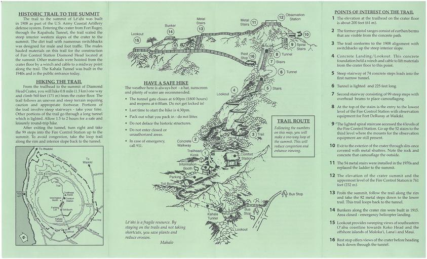 | Keywords: Diamond Head - Side 2.jpg en Back side of the brochure for Diamond State Park and US military installation Unknown Handout at Diamond Head State Monument US and Hawaii State Goverments other versions PD-USGov Uploaded with UploadWizard Uncategorized 2015 January 14 |