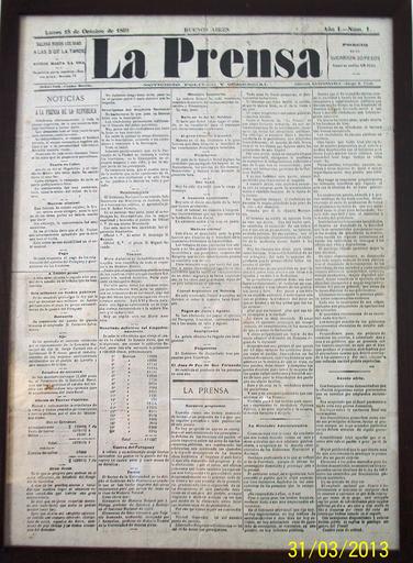 | Keywords: Diario La Prensa, Buenos Aires, Argentina, primer ejemplar.JPG en Copy of La Prensa Argentine newspaper 1 es Primer ejemplar del diario La Prensa Buenos Aires Argentina 1869-10-31 Own scan La Prensa PD-AR-Anonymous PD-1923 watermark La Prensa Argentina 1869 in Argentina |