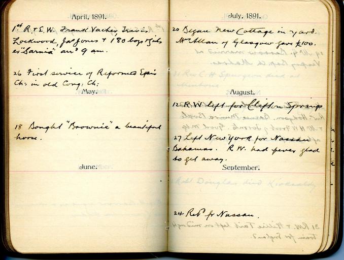 Keywords: 1880s 1890s 1900s 1910s 1920s diaries home children homechildren April 1891 Apr. 1st, R &E W, Frank Vacher, Travis Lockwood, Jas Jones & 180 boys & girls ex "Sarnia" arrived 9 am Apr. 16, First service of Reformed Episcopal Church in old Congregational Church Apr. 18, Bought "Brownie", a beautiful horse. July 1891 Began new cottage in yard. Mrs. Allan of Glasgow gave 100 pounds August 1891 12th, R W left for Clifton Springs 27th, Left New York for Nassau Bahamas. R W had fever so glad to get away September 1891 Sept. 24th, Returned from Nassau April 1891 Apr. 1st, R &E W, Frank Vacher, Travis Lockwood, Jas Jones & 180 boys & girls ex "Sarnia" arrived 9 am Apr. 16, First service of Reformed Episcopal Church in old Congregational Church Apr. 18, Bought "Brownie", a beautiful horse. July 1891 Began new cottage in yard. Mrs. Allan of Glasgow gave 100 pounds August 1891 12th, R W left for Clifton Springs 27th, Left New York for Nassau Bahamas. R W had fever so glad to get away September 1891 Sept. 24th, Returned from Nassau |