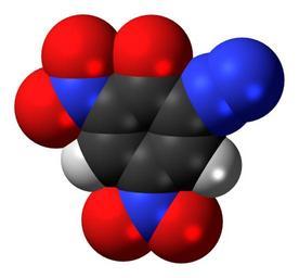 Keywords: Diazodinitrophenol-3D-spacefill.png Space-filling model of the diazodinitrophenol molecule an explosive nitro compound Colour code 505050 Carbon C black<br> F0F0F0 Hydrogen H white<br> F51E1E Oxygen O red<br> 3C50FA Nitrogen N blue<br> 2011-01-27 own DS Visualizer Jynto talk Ball-and-stick version cc-zero Diazo compounds Dinitrophenols Explosives Images by Jynto Space-filling models |