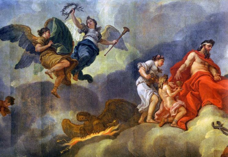 Keywords: Die Einführung des Ganymed in den Olymp (van Loo).jpg Marble Hall Institution Neues Palais Potsdam Stiftung Preussische Schlösser und Gärten GK I 8143 <br>At 240 square meters 2 583 square feet this is the largest canvas ceiling painting north of the Alps <br>The chief changes between van Loo's preliminary oil sketch shown below and the final execution are the addition of Hebe and Hephaestus as well as the covering of the cartouche with a green cloth The cartouche in the oil sketch features a crown and the initials FR Fridericus Rex These changes were surely made at Friedrich's direction The addition of Hebe has been interpreted as a nod to Friedrich's beloved sister Wilhelmine The covering of his initials was seen by contemporaries as indicative of Friedrich's modesty <br>In Greek mythology Zeus made Ganymede cupbearer to the gods at Olympus supplanting Hebe Marmorsaal Institution Neues Palais Potsdam Stiftung Preußische Schlösser und Gärten GK I 8143 <br>Es ist mit 240 m² Fläche das größte Leinwanddeckengemälde nördlich der Alpen <br>Die Hauptunterschiede zwischen der unten abgebildeten vorläufigen Ölskizze und dieser Ausführung sind die Hinzufügung der Figuren Hebe und Hephaistos sowie die Verdeckung der Kartusche mit einem grünen Tuch Auf der Kartusche der Ölskizze sind eine Krone und die Buchstaben FR Fridericus Rex sichtbar Diese Änderungen erfolgten wohl auf Anweisung Friedrichs Die Hinzufügung von Hebe ist als Reverzerweisung an Friedrichs Lieblingsschwester Wilhelmine gedeutet worden Schon von Zeitgenossen wurde die Abdeckung von Friedrichs Initialen auf der Kartusche als Anzeichen seiner Bescheidenheit ausgelegt <br>In der griechischen Mythologie wurde Ganymed als Hirtenknabe von Zeus auf den Olymp entführt damit er dort Mundschenk für die Götter sei und ewig dort lebe In dieser Aufgabe löste er Hebe die Tochter des Zeus und der Hera gegen den Willen Heras ab 1768 Friederisiko Friedrich der Große Die Essays ed Generaldirektion der Stiftung Preußische Schlösser und Gärten Berlin-Brandenburg Munich Hirmer 2012 p 130 artwork Creator Charles-Amédée-Philippe van Loo file James Steakley https //commons wikimedia org/wiki/Die_Einf C3 BChrung_des_Ganymed_in_den_Olymp_ 28van_Loo 29 Gallery view thumb left In the preliminary oil sketch angels bear a shield with a crown and Friedrich's initials thumb left The final version includes Hebe at left and Hephaestus below thumb left A drape conceals Friedrich's initials on the shield PD-Art-100 ImageNote 1 1368 526 228 162 2202 1512 2 Hebe Juventas ImageNoteEnd 1 ImageNote 2 1522 730 250 190 2202 1512 2 Ganymede Catamitus ImageNoteEnd 2 ImageNote 3 1839 399 256 176 2202 1512 2 Zeus Jupiter ImageNoteEnd 3 ImageNote 4 647 1096 468 174 2202 1512 2 Golden Eagle sacred to Zeus Jupiter who took the form of an eagle to abduct Ganymede ImageNoteEnd 4 ImageNote 5 308 185 628 468 2202 1512 2 Angels bearing a draped cartouche that originally showed a crown and Friedrich's initials ImageNoteEnd 5 The Induction of Ganymede in Olympus van Loo |
