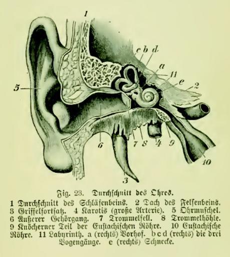 | Keywords: Die Frau als Hausärztin (1911) 023 Durchschnitt des Ohres.png 0 1 Durchschnitt des Schläfenbeins <br/> 0 2 Dach des Felsenbeins <br/> 0 3 Griffelfortsatz <br/> 0 4 Karotis große Arterie <br/> 0 5 Ohrmuschel <br/> 0 6 Äußerer Gehörgang <br/> 0 7 Trommelfell <br/> 0 8 Trommelhöhle <br/> 0 9 Knöcherner Teil der Eustachischen Röhre <br/> 10 Eustachische Röhre <br/> 11 Labyrinth <br/> a rechts Vorhof <br/> b c d rechts die drei Bogengänge <br/> e rechts Schnecke <br/> <br/> 1911 Die Frau als Hausärztin Mit 485 Original-Illustrationen 38 Tafeln und Kunstbeilagen in feinstem Farbendruck dem Porträt der Verfasserin und einem Modell-Album Mann und Weib 800 000 Jubiläumsausgabe Süddeutsches Verlagsinstitut Stuttgart 1911 diefraualshaus00fiscuoft Creator Anna Fischer-Dückelmann Custom license marker 2014 01 03 PD-US PD-old Illustrations from Die Frau als Hausärztin Uploaded with UploadWizard Anatomical plates and drawings of the human ears Diagrams of the human ears All portions of the human ear |