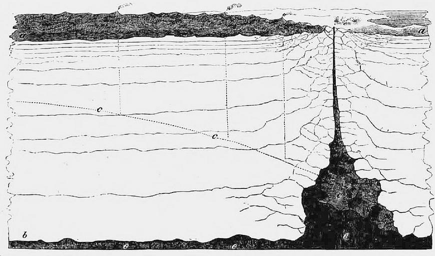 Keywords: Die Gartenlaube (1853) b 028.jpg de žNun bitte ich Dich mein kleines Bildchen zur Hand zu nehmen Ich brauche wohl kaum vorauszuschicken daß das Dargestellte keines Menschen Auge gesehen hat noch jemals sehen wird Es ist eben eine Veranschaulichung des in Uebereinstimmung mit den Naturgesetzen und andern ähnlichen Erscheinungen übereinstimmend Gedachten Eine solche Darstellung nennt man deshalb ein Schema Das vorliegende stellt Dir den senkrechten Durchschnitt eines Stückes der Erstarrungsrinde unserer Erde dar von der Oberfläche derselben a bis an ihre innere Grenze b über dem Heerde des Centralfeuers e e e Die Entfernung von a bis b beträgt also 50 Meilen die angenommene Dicke der Erstarrungsrinde Was über der Linie a a liegt ist also ein Stück Erdoberfläche Auf demselben siehst Du rechts das Meer dicht daneben einen Vulkan von dem sich in einer etwas gekrümmten Linie nach links eine Bergkette d d d hinzieht Auf dieser zeichnen sich noch 3 andere Vulkane aus Mein in Gedanken gemachter senkrechter Durchschnitt geht von der Spitze des ersten Vulkans durch dessen Eruptionskanal abwärts; dieser wird unten immer weiter und mündet unten in einen weiten Spalt c der einen innern Seite der Erstarrungsrinde aus Darunter liegt nun der furchtbare Heerd des Centralfeuers e e e der in der Wirklichkeit freilich nicht so schwarz aussehen wird wie auf meinem Schema Du wirst Dich nach meiner Zeichnung leicht hinein finden wenn ich nur hinzufüge daß wie oben die Bergkette sich unten in derselben Richtung wie es die Punktlinie c c andeutet der Spalt fortsetzt dessen Querschnitt wir bei c sehen Von dem 2 3 und 4 Vulkane ausgehende senkrechten Punktlinien die auf die Punktlinie c c fallen zeigen Dir den Zusammenhang dieser Vulkane mit demselben Spalte der Erdrinde mit dem wir bei c den ersten Vulkan zusammenhängen sehen Johannes Frisch 1853 Aus der Menschenheimath Dritter Brief Die Vulkane in Die Gartenlaube 1853 The Garden Arbor pages 28 to 30 028 Diagrams of volcanoes History of geology |