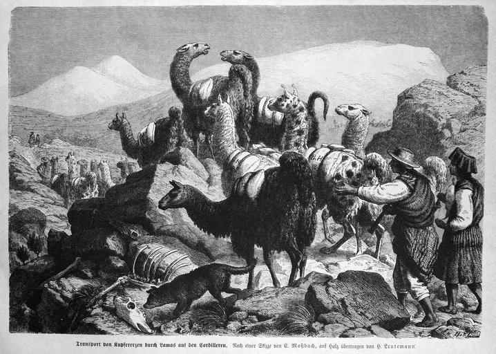 Keywords: Die Gartenlaube (1874) b 343.jpg 343 344 Heinrich Leutemann Pack animals Animal-powered transport in art Llamas in art History of South America