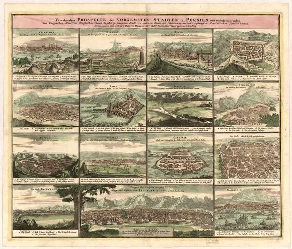 | Keywords: Different Views of the Major Cities in Persia WDL11740.png  Artwork ru Хоманн Иоганн Баптист 1663 1724 гг fr Homann Jean-Baptiste 1663-1724 en Homann Johann Baptist 1663-1724 zh 约翰·巴提斯特· 曼,1663 - 1724 年 pt Homann Johann Baptist 1663 a 1724 ar هومان، يوهان بابتيست، 1663-1724 es Homann Johann Baptist 1663-1724 ru Различные виды главных го одов Пе сии fr Différentes vues des principales villes de Perse en Different Views of the Major Cities in Persia zh 波斯主要城市的不同景观图 pt Diferentes imagens das principais cidades da Pérsia ar مناظِر مختلِفة للمُدُن الرئيسية في بلاد فارس ru  а этой ка те составленной г аве ом и издателем из  ю нбе га Иоганном Баптистом Хоманном 1663 1724 гг изоб ажены виды с воздуха на 15 го одов Пе сии сов еменный И ан Афганистана Южной России Восточной Ту ции и Кавказа Под изоб ажением каждого го ода стоит циф а или буква обозначающая самые важные точки го ода го одские во ота и стены водоемы ко олевские дво цы и  ынки  а ка те п едставлены следующие го ода 1 Аст ахань Россия ; 2 Де бент Дагестан Россия ; 3 Тифлис Г узия ; 4 Ка с Ту ция ; 5 Э зу ум Ту ция ; 6 Баку Азе байджан ; 7 Сольтание п овинция Зенджан И ан ; 8 Шемаха Ши ванский  айон Азе байджан ; 9 Е еван А мения ; 10 Ши аз И ан ; 11 Кандага Афганистан ; 12 А дебиль И ан ; 13 Кашан п овинция Исфахан И ан ; 14 Исфахан И ан и 15 Бенде -Аббас И ан Исфахан обозначен как столица Пе сидского ца ства по с авнению с д угими го одами его изоб ажение более к упное Ши аз оп еделен как д евний го од Пе сеполь и бывшая столица Пе сидской импе ии Кандага описан как го од-к епость на г анице Пе сии с Индией Э зу ум  асположенный на те  ито ии сов еменной Ту ции обозначен как die Grantz-Stadt in Armenien а мянский пог аничный го од <br>Аэ офотоснимки; Го ода и поселки fr Cette carte réalisée par Jean-Baptiste Homann 1663-1724 graveur et éditeur de Nuremberg est composée de 15 vues aériennes de villes situées en Perse Iran actuel et en Afghanistan ainsi que dans le sud de la Russie l'est de la Turquie et la région du Caucase Sous chaque image une légende numérotée ou lettrée indique les points les plus importants de chaque ville notamment les portes et les remparts les étendues d'eau les palais royaux et les marchés Les villes représentées sont 1  Astrakhan en Russie 2  Derbent Daguestan en Russie 3  Tbilissi en Géorgie 4  Kars en Turquie 5  Erzurum en Turquie 6  Bakou en Azerbaïdjan 7  Sultaniya province de Zanjan en Iran 8  Chamakhi région de Chirvan en Azerbaïdjan 9  Erevan en Arménie 10  Chiraz en Iran 11  Kandahar en Afghanistan 12  Ardabil en Iran 13  Kashan province d'Ispahan en Iran 14  Ispahan en Iran et 15  Bandar Abbas en Iran Ispahan est indiquée comme la capitale du royaume de Perse et sa vue est plus grande que celles des autres villes Chiraz est désignée comme la ville antique de Persépolis et l'ancienne capitale de l'Empire perse Kandahar est décrite comme « une forteresse et ville située sur la frontière de la Perse et de l'Inde » Erzurum située en Turquie actuelle est identifiée comme « die Grantz-Stadt in Armenien » la ville frontalière arménienne <br>Vues aériennes; Petites et grandes villes en This map by the Nuremberg engraver and publisher Johann Baptist Homann 1663-1724 features 15 aerial views of cities in Persia present-day Iran Afghanistan southern Russia eastern Turkey and the Caucasus region Beneath each city portrait is a number or letter key indicating the most important points in each city including city gates and walls bodies of water royal palaces and markets The cities depicted are 1 Astrakhan Russia; 2 Derbent Dagestan Russia; 3 Tiflis Georgia; 4 Kars Turkey; 5 Erzurum Turkey; 6 Baku Azerbaijan; 7 Sultanieh Zanjān Province Iran; 8 Şamaxı Shirvan Region Azerbaijan; 9 Yerevan Armenia; 10 Shiraz Iran; 11 Kandahar Afghanistan; 12 Ardabil Iran; 13 Kashan Isfahan Province Iran; 14 Isfahan Iran; and 15 Bandar Abass Iran Isfahan is identified as the capital of the kingdom of Persia and shown larger than the other cities Shiraz is identified as the ancient city of Persepolis and the former capital of the Persian Empire Kandahar is described as a fortress and city on the Indian border of Persia Erzurum located in present-day Turkey is identified as die Grantz-Stadt in Armenien the Armenian border town <br>Aerial views; Cities and towns zh 这张 图由纽伦堡的雕刻师兼出版商约翰·巴提斯特· 曼(Johann Baptist Homann,1663-1724 年) 绘  图展现了 15 幅波斯(今伊 ) 阿富汗 俄罗斯南部   其 部以及高加索 区城市的空中鸟瞰图 每幅城市图下方都   数字或 字母图例指出每个城市中 重要的 点,其中包括城门 城墙 水体 皇宫及市  图中的 15 个城市分别是 1 俄罗斯的阿斯特拉罕, 2 俄罗斯达吉斯 的 尔宾特, 3 格鲁吉亚的第比利斯, 4   其的卡尔斯, 5   其的埃尔祖鲁姆, 6 阿塞 疆的巴库, 7 伊 的苏丹尼 (赞詹 ), 8 阿塞 疆的沙马基(希尔凡 区), 9 亚