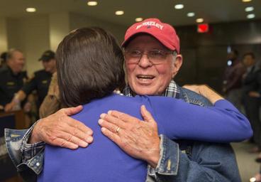 Keywords: dsc_5237.jpg dsc5237jpg austin tx usa people Luci Baines Johnson, daughter of President Lyndon Johnson, greets singer/songwriter Country Joe McDonald backstage at the LBJ Presidential Library on Thursday, April 28, 2016. McDonald performed at the Library as part of its Vietnam War Summit. McDonald sang his memorable Vietnam War protest song, "I Feel Like I'm Fixin' to Die Rag" while folk singer Peter Yarrow sang "Where Have All the Flowers Gone?" The two musicians appeared together to discus how the war protest music of the 1960s and 1970s helped to comfort U.S. troops in Vietnam while fueling the anti-war movement at home. The music discussion was moderated by Bob Santelli, executive director of the GRAMMY Museum. LBJ Library photo by Jay Godwin 04/28/2016 Luci Baines Johnson, daughter of President Lyndon Johnson, greets singer/songwriter Country Joe McDonald backstage at the LBJ Presidential Library on Thursday, April 28, 2016. McDonald performed at the Library as part of its Vietnam War Summit. McDonald sang his memorable Vietnam War protest song, "I Feel Like I'm Fixin' to Die Rag" while folk singer Peter Yarrow sang "Where Have All the Flowers Gone?" The two musicians appeared together to discus how the war protest music of the 1960s and 1970s helped to comfort U.S. troops in Vietnam while fueling the anti-war movement at home. The music discussion was moderated by Bob Santelli, executive director of the GRAMMY Museum. LBJ Library photo by Jay Godwin 04/28/2016