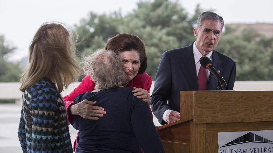 Keywords: outdoor Lynda Johnson Robb, daughter of President Lyndon Johnson and Lady Bird Johnson, hugs her friend Sally Griffis of Peachtree City, Georgia on Tuesday April 26, 2016 at the LBJ Presidential Library during its Vietnam War Summit. Griffis' husband, Marine Capt. William "Bill" Griffis, III, was killed during the Vietnam War on January 24, 1970. At left is the Griffises' daughter, Mitty Griffis Mirrer of Providence, Rhode Island, who was born just a few hours before the official notification of the death of her father. At right is Charles Robb, a Vietnam veteran, former governor and U.S. senator from Virginia, and Lynda Robb's husband. The Robbs recognized the contributions of Vietnam War veterans in a ceremony outside the LBJ Presidential Library as part of the library's three-day Vietnam War Summit. Each veteran at the ceremony received a Vietnam veteran lapel pin engraved on the back with “A Grateful Nation Thanks and Honors You.” The LBJ Presidential Library is hosting the Vietnam War Summit to discuss and reflect upon the lessons and legacy of the 50-year-old war. The Vietnam War Summit runs from April 26-April 28 at the LBJ Library. LBJ Library photo by Nick Ut 04/26/2016. Lynda Johnson Robb, daughter of President Lyndon Johnson and Lady Bird Johnson, hugs her friend Sally Griffis of Peachtree City, Georgia on Tuesday April 26, 2016 at the LBJ Presidential Library during its Vietnam War Summit. Griffis' husband, Marine Capt. William "Bill" Griffis, III, was killed during the Vietnam War on January 24, 1970. At left is the Griffises' daughter, Mitty Griffis Mirrer of Providence, Rhode Island, who was born just a few hours before the official notification of the death of her father. At right is Charles Robb, a Vietnam veteran, former governor and U.S. senator from Virginia, and Lynda Robb's husband. The Robbs recognized the contributions of Vietnam War veterans in a ceremony outside the LBJ Presidential Library as part of the library's three-day Vietnam War Summit. Each veteran at the ceremony received a Vietnam veteran lapel pin engraved on the back with “A Grateful Nation Thanks and Honors You.” The LBJ Presidential Library is hosting the Vietnam War Summit to discuss and reflect upon the lessons and legacy of the 50-year-old war. The Vietnam War Summit runs from April 26-April 28 at the LBJ Library. LBJ Library photo by Nick Ut 04/26/2016. |