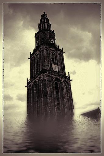 Keywords: digital art framed flooded church tower underwater weather mood surreal atmosphere water architecture building religion