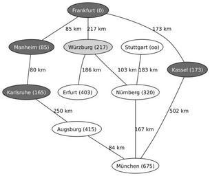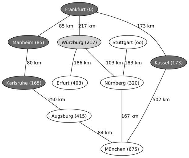 Keywords: DijkstraStep05.svg Fifth Step of a run of Dijkstra's algorithm on a map of Germany see Image MapGermanyGraph svg Created by de Benutzer Regnaron with graphviz Dijkstra's algorithm