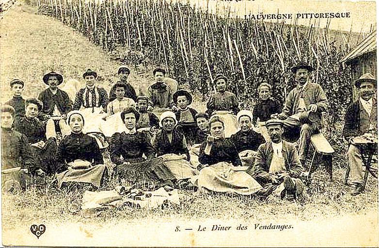 | Keywords: Diner de vendange 1907.jpg fr Repas de midi dîner des vendangeurs dans l'Auvergne en 1907 2011-06-30 Scan old postcard VDC PD-old Uploaded with UploadWizard Côtes d'Auvergne AOC Wine and vineyard in Puy-de-Dôme Harvest wine in France Postcards of people in France Peasant lunch |