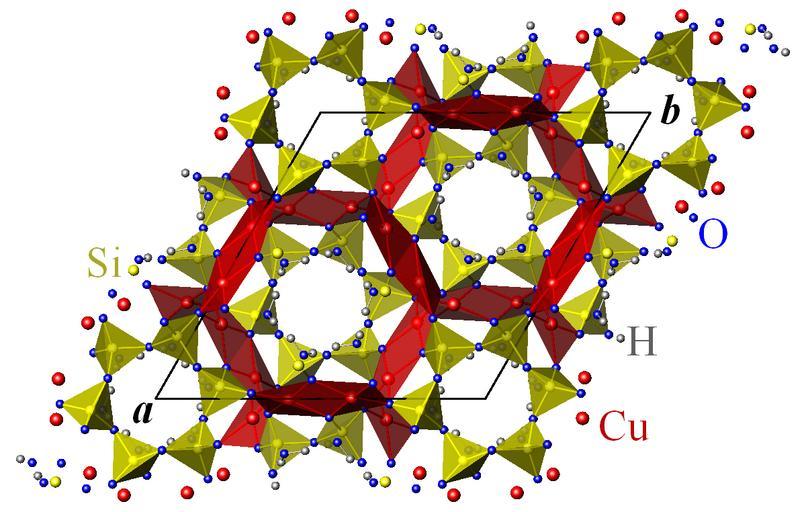 Keywords: Dioptase structure.png en Crystal structure of dioptase CuSiO3·H2O R-3 hexagonal cell projected onto the a b plane own Perditax 2010-09-13 Dioptase Copper compounds Cyclosilicates Crystal structures