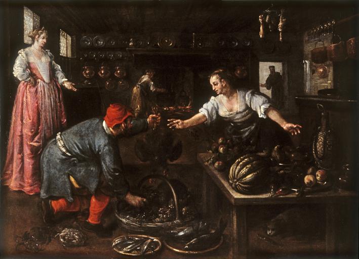 Keywords: Dirck de Vries - Kitchen Interior - Walters 372651.jpg De Vries was one of many Netherlandish artists who left his war-torn homeland to come to Venice where he painted Netherlandish subjects in a Venetian style As in the Netherlandish tradition the kitchen of this wealthy home is full of everyday details such as meat hung to dry The cook reaches for the roosters offered by the tradesman In Dutch plays on the word for bird can refer to sexual intercourse In the lusty manner of Netherlandish paintings and popular prints of market folk the man is propositioning the cook in front of her mistress who does not understand peasant body language The lady's dress and platform shoes identify her and the setting as Venetian and De Vries has adopted the broad brush strokes of his Venetian colleagues ca 1600 Oil on canvas cm 97 8 134 7 accession number 37 2651 9960 Sale Christie's New York January 11 1991 lot 17 Walters Art Museum 1991 by purchase Museum purchase 1991 Artful Dining The Exhibition The Walters Art Gallery Baltimore 1994 place of origin Venice Italy Walters Art Museum license 2D Renaissance paintings in the Walters Art Museum Dirck de Vries Kitchen interiors in Dutch genre paintings 1600 paintings in the United Kingdom Paintings of baskets Pumpkins in paintings Crabs in art Copper in art 17th-century oil on canvas paintings in the United Kingdom Chopines
