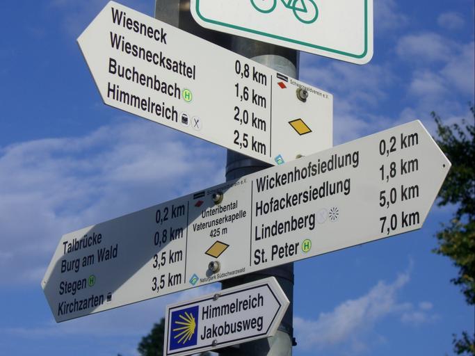 Keywords: directory signposts shield direction marking arrow signpost waymarks migratory character hiking trails note sky blue black forest