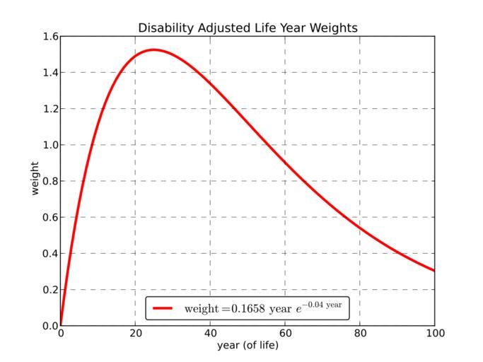 | Keywords: Disability Adjusted Life Year Weight Plot.svg en Plot of the arbitrary formula used to discount years of life for the young and old in policy decisions Year of life against weights using the reationship y 0 1658 year e -0 04 year Svg made with matplotlib for python - Some studies use DALYs calculated to place greater value on a year lived as a young adult This formula produces average values around age 10 and age 55 a peak around age 25 and lowest values among very young children and very old people Comparable to Figure 3 1 in this WHO report http //www who int/quantifying_ehimpacts/publications/en/9241546204chap3 pdf 2012-01-10 own Martin Strand Uploaded with UploadWizard Public health Healthcare statistics United Nations World Health Organization |