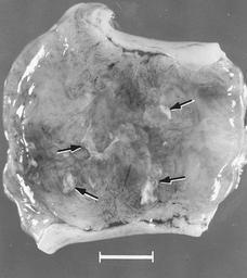 Keywords: Diseases of Swine 17-5.png en 17 5 Segment of uterus opened to show necrotic remnants of a partially resorbed PPV-infected embryo arrows and associated extraembryonic membranes of a gilt experimentally infected oronasally immediately after breeding and killed 22 days later; remnants are laden with virus and viral antigen Bar 1 cm Mengeling et al 1980a Diseases of Swine 8th edition W L Mengeling W L Mengeling According to its copyright statement Copyright is not claimed for Chapters 17 23 25 31 and 64 which are in the public domain Diseases and disorders of pigs |