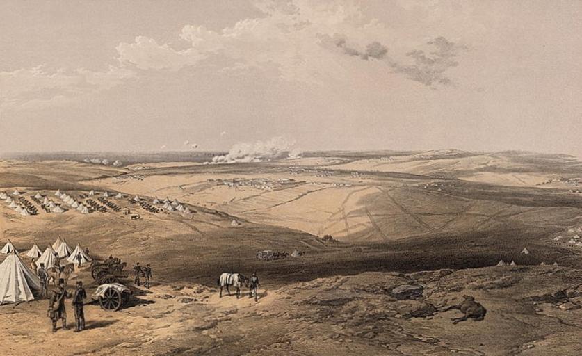 | Keywords: Distant view of Lord Raglan's head quarters before Sebastopol.jpg Artwork en Print shows several British military camps an ambulance a distant view of Lord Raglan's headquarters just left of center and in the foreground a dead horse W Simpson; T Picken lith 38 4 x 57 1 print lithograph tinted accession number LC-DIG-ppmsca-05672 digital file from original print PGA - Simpson--Seat of war pl 9 C size P P Institution Library of Congress ppmsca 05672 Rights Advisory No known restrictions on publication <gallery> </gallery> Title from item Plate in The seat of war in the east Dedicated by permission to Her most gracious Majesty the Queen / William Simpson First series London Published by Paul Dominic Colnaghi Co publishers to Her Majesty 13 14 Pall Mall East ; Paris Goupil Cie 1855 plate 9 Colnaghis' authentic series Attached to the edge of the sheet is a printed Key to second charge which identifies the military camps depicted PD-100 William Simpson Uploaded with UploadWizard |