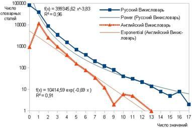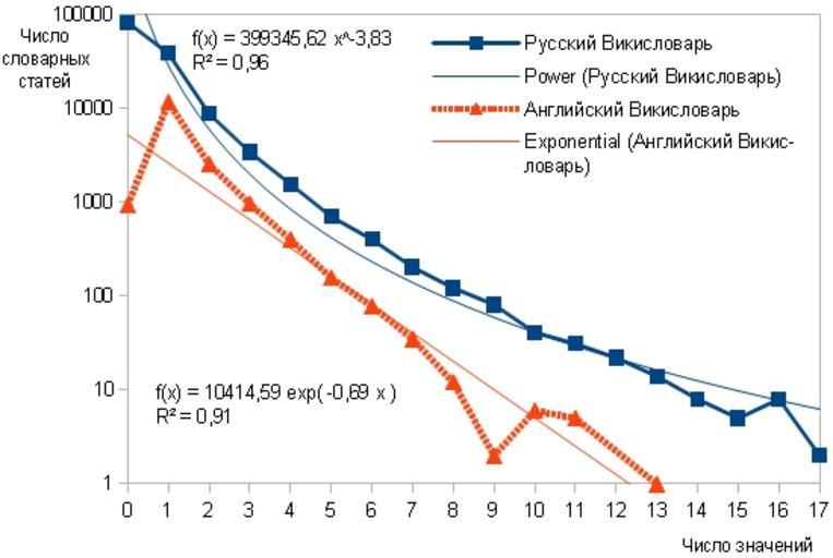 | Keywords: Distribution number of meanings of Russian words in ruwikt and enwikt 2011.jpg  The distribution of Russian words with respect to the number of meanings in the Russian Wiktionary the upper curve approximations to the power function in the English Wiktionary low curve approximations to the exponent function 2011 Russian Wiktionary upper the edition as of May 21 2011 English Wiktionary low the edition as of October 8 2011 Расп еделение  усских слов по числу значений в Русском Викислова е ве хняя к ивая апп оксимация степенной функцией и в Английском Викислова е нижняя к ивая апп оксимация экспоненциальной функцией данные за 2011 г own 2012-10-09 User AKA_MBG/Info AKA MBG Russian Wiktionary |