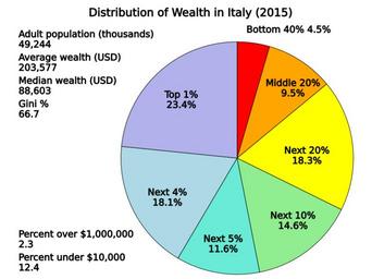 Keywords: Distribution of Wealth in Italy.svg translate yes en Wealth shares of different percentile groups in Italy in 2015 Data from Credit Suisse http //publications credit-suisse com/tasks/render/file/index cfm fileid C26E3824-E868-56E0-CCA04D4BB9B9ADD5 Table 6-5 Page 149 2016-07-20 own Delphi234 other versions cc-zero Distribution of wealth Economic inequality SVG pie charts |