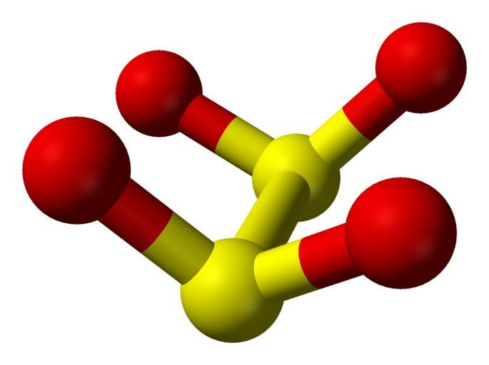 | Keywords: Dithionite-anion-from-xtal-3D-balls.png Ball-and-stick model of the dithionite anion S<sub>2</sub>O<sub>4</sub><sup>2 ˆ’</sup> as found in the crystal structure of sodium dithionite Na<sub>2</sub>S<sub>2</sub>O<sub>4</sub> X-ray crystallographic data from http //dx doi org/10 1007/BF01199531 J Chem Crystallogr 1992 22 291-301 Model constructed in http //www crystalmaker com/ CrystalMaker 8 1 Image generated in http //accelrys com/products/discovery-studio/visualization/discovery-studio-visualizer html Accelrys DS Visualizer Own 2009-02-27 Ben Mills Benjah-bmm27 Images by Ben Mills Dithionite ion |
