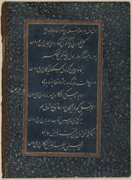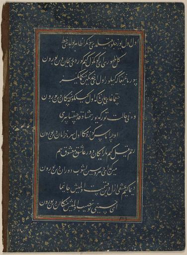 | Keywords: Divan of Sultan Husayn Mirza WDL6802.png  Artwork ru Хусейн Байка а Султан Хо асана 1438-1506 fr Ḥusayn Bāyqarā Sultan de Khorassan 1438-1506 en Ḥusayn Bāyqarā Sultan of Khorasan 1438-1506 zh 侯赛因·巴  拉̄ 呼罗珊苏丹 1438-1506 pt Ḥusayn Bāyqarā Sultão de Khorasan 1438-1506 ar حسين بيقرة سلطان خراسان 1438-1506 es Ḥusayn Bāyqarā Sultán de Khorasan 1438-1506 ru Диван султана Хусейна  и зы fr Divan du sultan Husayn Mirza en Divan of Sultan Husayn Mirza zh 苏丹侯赛因·米尔扎的诗集 pt Divã do Sultão Husayn Mirza ar ديوان السلطان حسين ميرزا ru Данный лист соде жит десять поэтических ст ок из дивана сбо ника стихотво ений составленного на тю кском чагатайском языке последним п авителем из династии Тиму идов султаном Хусейном  и зой 1438 1506 гг Выполненный письмом насталик в технике декупаж этот ф агмент относится к ныне  аз озненной  укописи каллиг афия кото ой возможно была выполнена султаном Али аль- ашхади п име но в 1490 г Султан Хусейн  и за ибн  ансу ибн Байка а был п авителем Хо асана со столицей в Ге ате на те  ито ии сов еменного Афганистана с 1469 г до своей сме ти в 1506 г Го од был важным культу ным цент ом кото ый п ивлекал не только тю кских и пе сидских поэтов но и исто иков художников и каллиг афов Сам п авитель был авто ом поэтических п оизведений тво ившим под псевдонимом Хусайни и его стихи на тю кском чагатайском языке <em>газели</em> в  азме е <em> амаль</em> составили сбо ник названный <em> Divan-i Husayni </em> Диван Хусайни  а этом листе буквы не написаны че нилами а искусно вы езаны из синей бумаги и затем наклеены на подложку к емового цвета об амленную полями ук ашенными золотыми вк аплениями на синем фоне Техника декупаж известна под названием <em>qit'a</em> что в буквальном пе еводе означает вы езание а художников  аботавших в этой технике называли <em>qati'an</em>  езальщики Каллиг афия в технике декупаж получила ши окое  асп ост анение в последней четве ти 15-го века как указано в т актате Кади Ахмада на эту тему написанном в 1015 г хидж ы 1606 г  н э <br>А абская каллиг афия; Иллюмини ование  укописей; Исламская каллиг афия; Исламские  укописи; Ту ецкая поэзия fr Ce feuillet comporte dix lignes de poésie extraite d'un divan recueil de poèmes écrit en turc tchagataï par le dernier souverain timouride le sultan Husayn Mirza 1438 1506 Rédigé en écriture nasta'liq par un processus de découpage ce fragment fait partie d'un manuscrit aujourd'hui dispersé peut-être calligraphié par le sultan 'Ali al-Mashhadi vers 1490 Le sultan Husayn Mirza b Mansur b Bayqara souverain du Khorrasan vécut à Hérat capitale du pays aujourd'hui en Afghanistan de 1469 à sa mort en 1506 La ville était un centre culturel important attirant à la fois des poètes turcs et persans ainsi que des historiens des artistes et des calligraphes Le souverain lui-même écrivait de la poésie sous le nom de plume d'Husayni et ses poèmes en turc tchagataï <em>ghazals</em> en mètre <em>ramal</em> furent réunis dans un recueil appelé le <em>divan-i Husayni</em> Les lettres de ce feuillet ne sont pas écrites à l'encre mais ont été découpées très adroitement à partir d'un papier bleu et collées sur un fond de couleur crème dont les marges sont pourvues d'un cadre décoré d'un saupoudrage d'or sur fond bleu Cette technique de découpage est connue sous le nom de <em>qit'a</em> un terme signifiant littéralement <em>découpe</em> et les artistes spécialisés dans cette technique étaient appelés les <em>qati'an</em> coupeurs La calligraphie en découpage devint populaire vers le dernier quart du XV<sup>e</sup> siècle comme le montre clairement le traité de Qadi Ahmad de 1015 A H 1606 apr J -C sur le sujet <br>Calligraphie arabe; Enluminures; Calligraphie islamique; Manuscrits islamiques; Poésie turque en This folio includes ten lines of poetry from a divan compendium of poems written in Chagatay Turkish by the last Timurid ruler Sultan Husayn Mirza 1438 1506 Executed in nasta'liq script through a process of découpage the fragment belongs to a now dispersed manuscript possibly calligraphed by Sultan 'Ali al-Mashhadi around 1490 Sultan Husayn Mirza b Mansur b Bayqara was ruler of Khurasan based in its capital city of Herat present-day Afghanistan from 1469 to his death in 1506 The city was an important cultural center attracting both Turkish and Persian poets as well as historians artists and calligraphers The ruler himself composed poetry using the pen name Husayni and his Chagatay Turkish poems <em>ghazals</em> in <em>ramal </em>meter were compiled in a collection called the <em>Divan-i Husayni</em> This folio s letters are not written in ink but have been cut out very sk