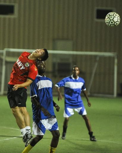 Keywords: Djibouti vs. South Korea soccer 140127-N-LE393-146.jpg en Players vie for control of the ball during a soccer match between a South Korean navy team in red and a Djiboutian team The teams tied 1-1 The match was part of the 2014 Camp Lemonnier World Cup featuring teams from South Korea Djibouti America Spain Italy Germany France and Japan U S Navy photo by Mass Communication Specialist 1st Class Eric Dietrich/Released 2014-01-27 Petty Officer 1st Class Eric Dietrich https //www dvidshub net/image/1157004 140127-N-LE393-146 2014-01-28 08 34 DJ PD-USGov-Military-Navy Camp Lemonnier Images from DoD uploaded by Fæ |