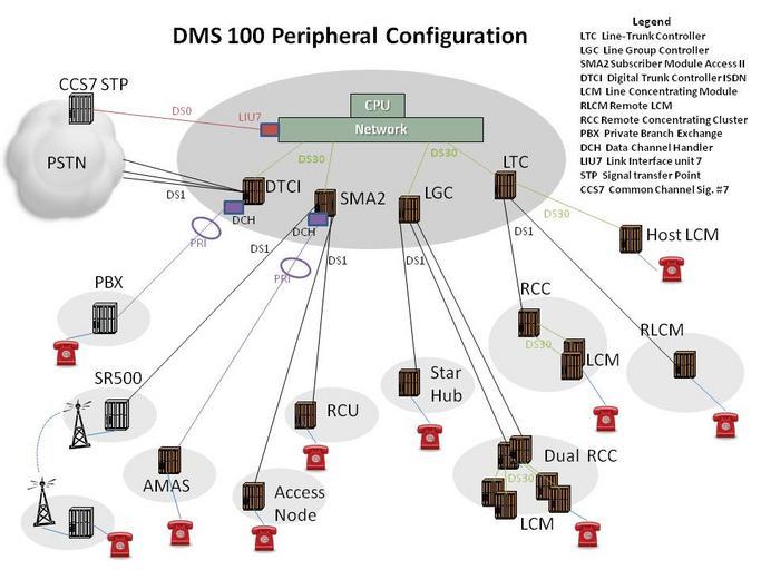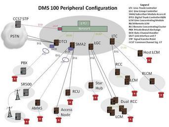 Keywords: DMS100 peripheral.jpg badjpeg en Peripheral configuration showing the most common peripheral modules used in the DMS 100 switching system own PKgallag 2011-04-04 Cc-zero Nortel Telephone exchange equipment Telephone diagrams