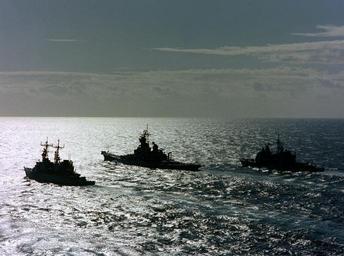 | Keywords: n07b4 mediterranean sea mediterraneansea outdoor sea vehicle boat A silhouetted port quarter view of the guided missile cruiser USS Ticonderoga (CG-47), right, the battleship USS Iowa (BB-61), center, and the guided missile destroyer USS Dewey (DDG-45) underway. Official U.S. Navy Photograph, now in the collections of the National Archives in the Online Public Access. A silhouetted port quarter view of the guided missile cruiser USS Ticonderoga (CG-47), right, the battleship USS Iowa (BB-61), center, and the guided missile destroyer USS Dewey (DDG-45) underway. Official U.S. Navy Photograph, now in the collections of the National Archives in the Online Public Access. |