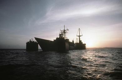 Keywords: newport rhode island (ri) rhodeislandri united states of america (usa) unitedstatesofamericausa outdoor sea vehicle boat water ocean A silhouetted port bow view of the damaged guided missile frigate USS SAMUEL B. ROBERTS (FFG 58) as the Dutch heavy lift ship MIGHTY SERVANT II floods its decks prior to releasing the frigate. The SAMUEL B. ROBERTS was struck by an Iranian mine while on patrol in the Persian Gulf, , 07/30/1988. U.S. Navy Photograph, now in the collections of the U.S. National Archives: Online Public Access. A silhouetted port bow view of the damaged guided missile frigate USS SAMUEL B. ROBERTS (FFG 58) as the Dutch heavy lift ship MIGHTY SERVANT II floods its decks prior to releasing the frigate. The SAMUEL B. ROBERTS was struck by an Iranian mine while on patrol in the Persian Gulf, , 07/30/1988. U.S. Navy Photograph, now in the collections of the U.S. National Archives: Online Public Access. |